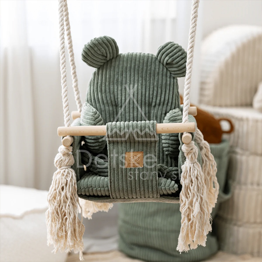 Hojdačka je vyrobená z najkvalitnejšieho jemného materiálu typu hrubý menšester - Corduroy. Na dotyk príjemná tkanina s nápadným a neopozeraným rebrovaním. Zadný vankúš / operadlo je s roztomilými medvedími ušami a vnútornými vankúšikmi na bokoch pre maximálne pohodlie pri hojdaní. ŠTÝL tejto hojdačke dodáva nápadný masívny strapec na každom konci. Pevné lano zaručuje bezpečnosť nášho dieťaťa. Hrazdy sú vyrobené z masívneho bukového dreva, okrem očividných hodnôt, ktoré k hre patria, bude hojdačka krásnym, dekoratívnym prvkom každej miestnosti, obývačky a kdekoľvek chcete.