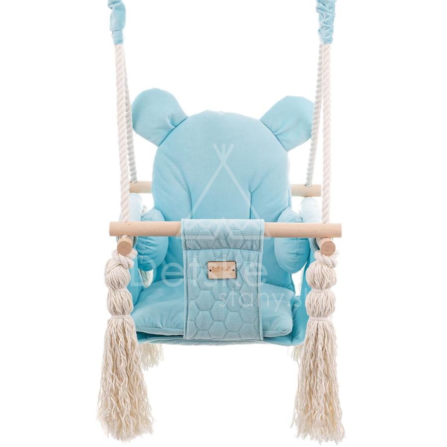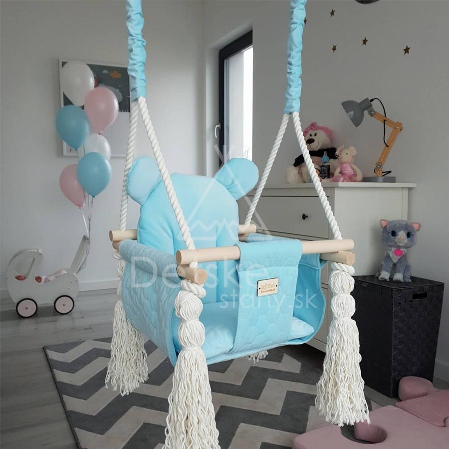 Hojdačka je vyrobená z najkvalitnejšieho jemného materiálu typu ZAMAT. Na dotyk príjemná tkanina s nápadným a neopozeraným prešívaním. Bezpečná hojdačka priateľská k deťom a najvyššej kvalite. Táto hojdačka má spevnené sedadlo aj operadlo. Zadný vankúš / operadlo je s roztomilými medvedími ušami a vnútornými vankúšikmi na bokoch pre maximálne pohodlie pri hojdaní. ŠTÝL tejto hojdačke dodáva nápadný masívny strapec na každom konci. Pevné lano zaručuje bezpečnosť nášho dieťaťa. Hrazdy sú vyrobené z masívneho bukového dreva, okrem očividných hodnôt, ktoré k hre patria, bude hojdačka krásnym, dekoratívnym prvkom každej miestnosti, obývačky a kdekoľvek chcete.