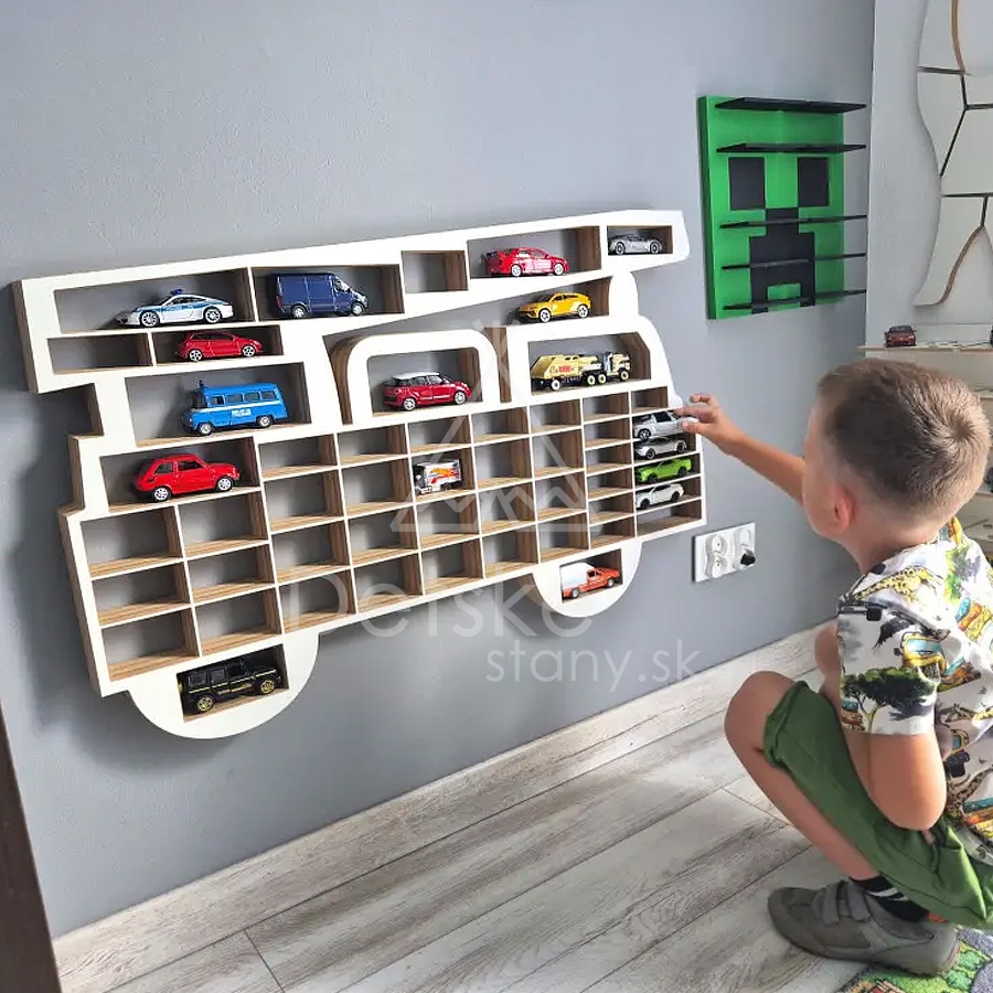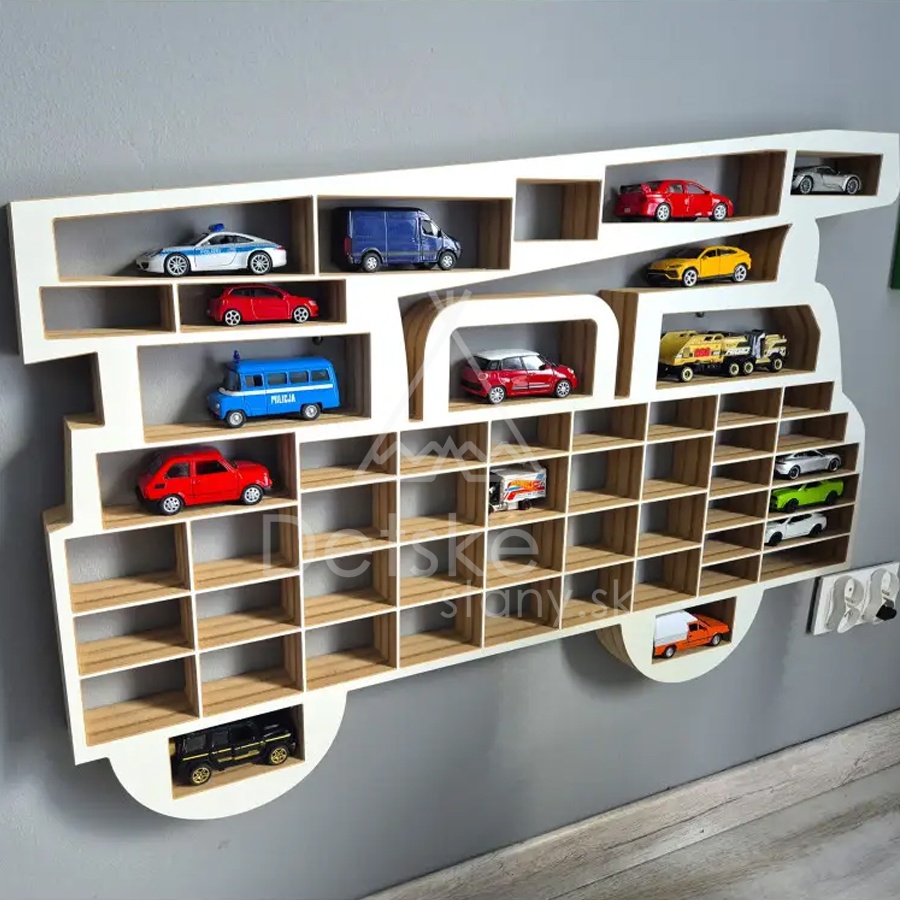 Ako to voláte? Organizér na autíčka, polička na autá, alebo parkovací dom, je v podstate jedno, hlavne že vykúzlite svojmu náruživému zberateľovi malých angličákov úsmev a spravíte veľkú radosť. Farba celého organizéru je biela, ale bočné hrany ostávajú v prírodnej farbe v súlade s minimalistickým škandinávskym štýlom. Neuvidíte tiež žiadne úchyty, pretože hrúbka dosky umožňuje, aby úchytky pre zavesenie boli zapustené do stojanu zozadu.