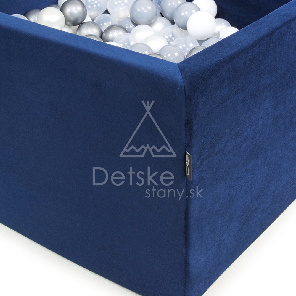 Granátovo modrá (královská modrá) bazénik v zamatovom - VELVET prevedení. Tým že je bazénik štvorcový je vhodný nielen do priestoru, ale aj do rohu, alebo pri stenu či posteľ. Farby guličiek sú: VOLITEĽNÉ alebo ŠEDÁ, BIELA a TRANSPARENTNÁ (ako na foto).